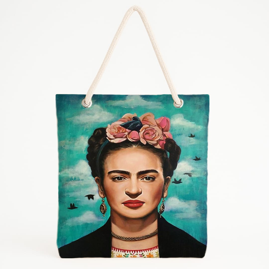 Turkuaz gökyüzü fonunda, Frida Kahlo’nun stilize portresi; pembe güllerle süslenmiş saçlar, kuş figürü ve geleneksel takılarla birlikte hem kültürel hem sanatsal bir anlatım sunuyor. Bu plaj çantası – tote bag, doğayla iç içe, dirençli ve özgün bir ruhu taşıyor. Kalın ip saplar ve metal detaylar; tasarımı hem sağlam hem estetik kılıyor. Kendini ifade edenler için ideal bir parça.