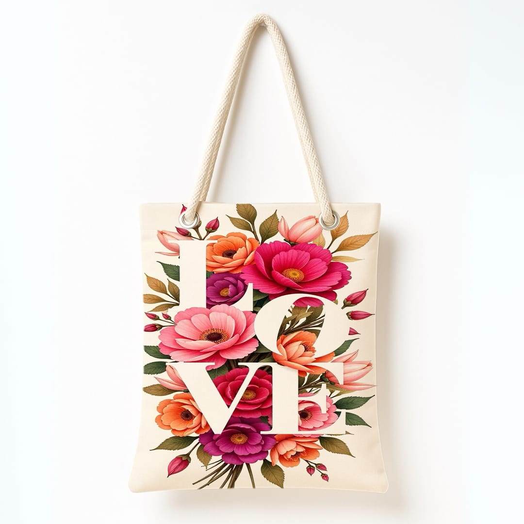 LOVE Yazılı Çiçek Desenli Bej Zeminli Duygusal Plaj Çantası