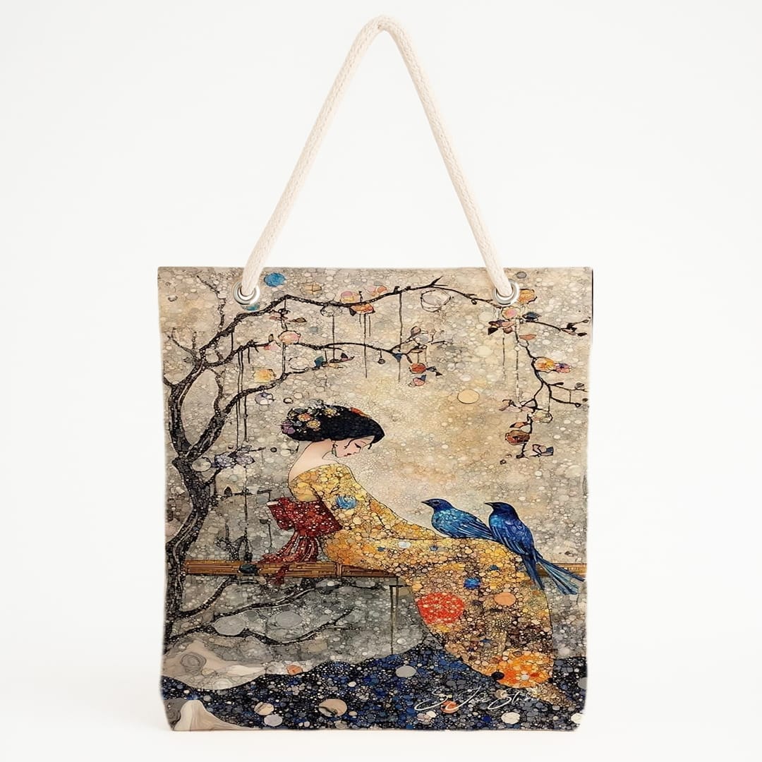 Bir bankta oturan kadın, başı eğik, etrafında mavi kuşlar ve çiçekli dallar… Bu plaj çantası – tote bag, doğanın sessizliğini ve geleneksel zarafeti bir araya getiriyor. Turkuaz, bej ve pembe tonlar; tasarımı hem huzurlu hem estetik kılıyor. Kalın ip saplarıyla sağlam, görseliyle şiirsel. İçsel dinginliği yanında taşıyanlar, yazın hem özgün hem duygusal görünmek isteyenler için ideal bir aksesuar.-+