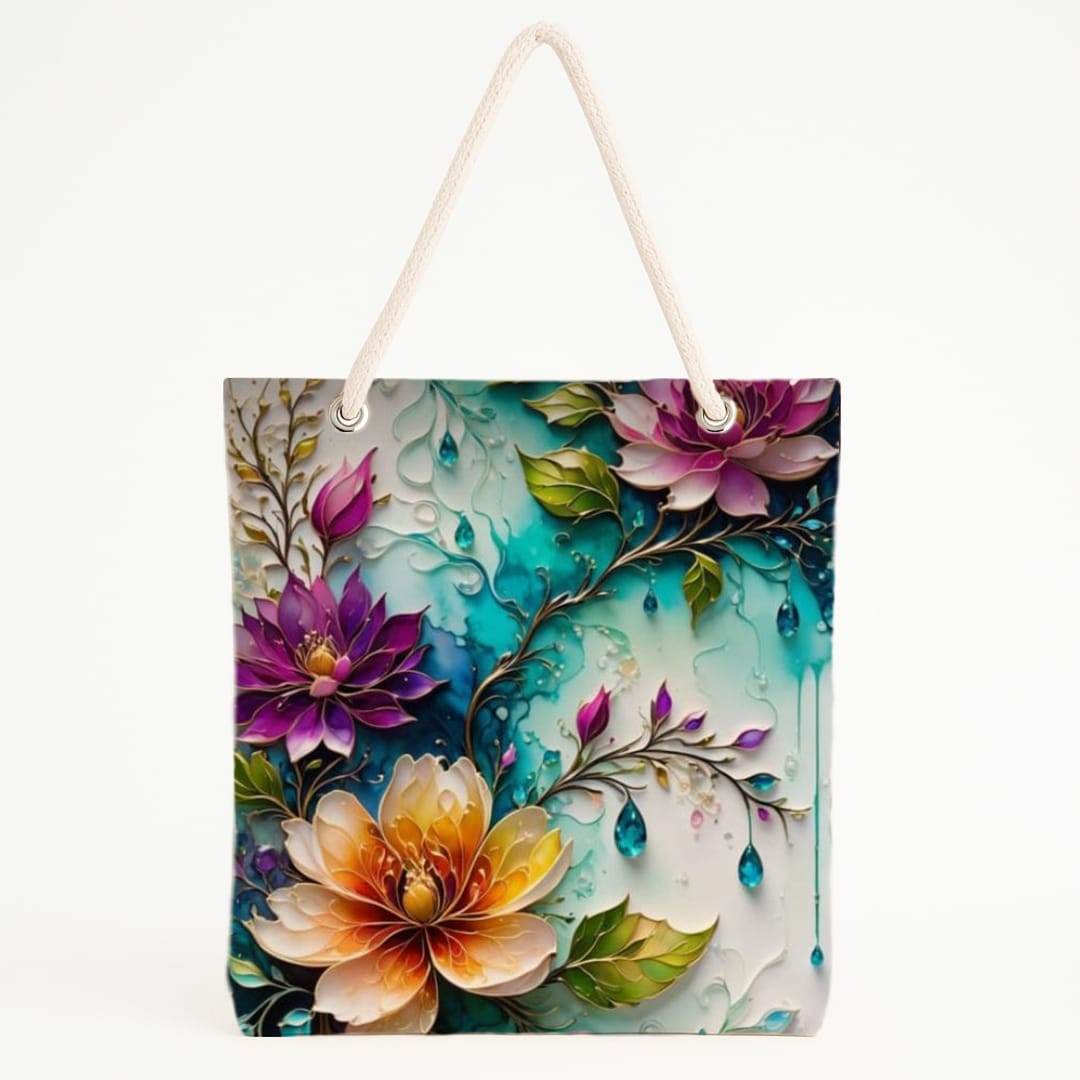 Büyük çiçekler, yeşil yapraklar ve mavi su damlaları… Bu plaj çantası – tote bag, doğanın renkli neşesini ve suyun serinliğini bir araya getiriyor. Turkuaz, mor ve turuncu tonlar; tasarımı hem enerjik hem zarif kılıyor. Kalın ip saplarıyla sağlam, görseliyle ferahlatıcı. Doğayı yanında taşıyanlar, yazın hem özgün hem estetik görünmek isteyenler için ideal bir aksesuar.