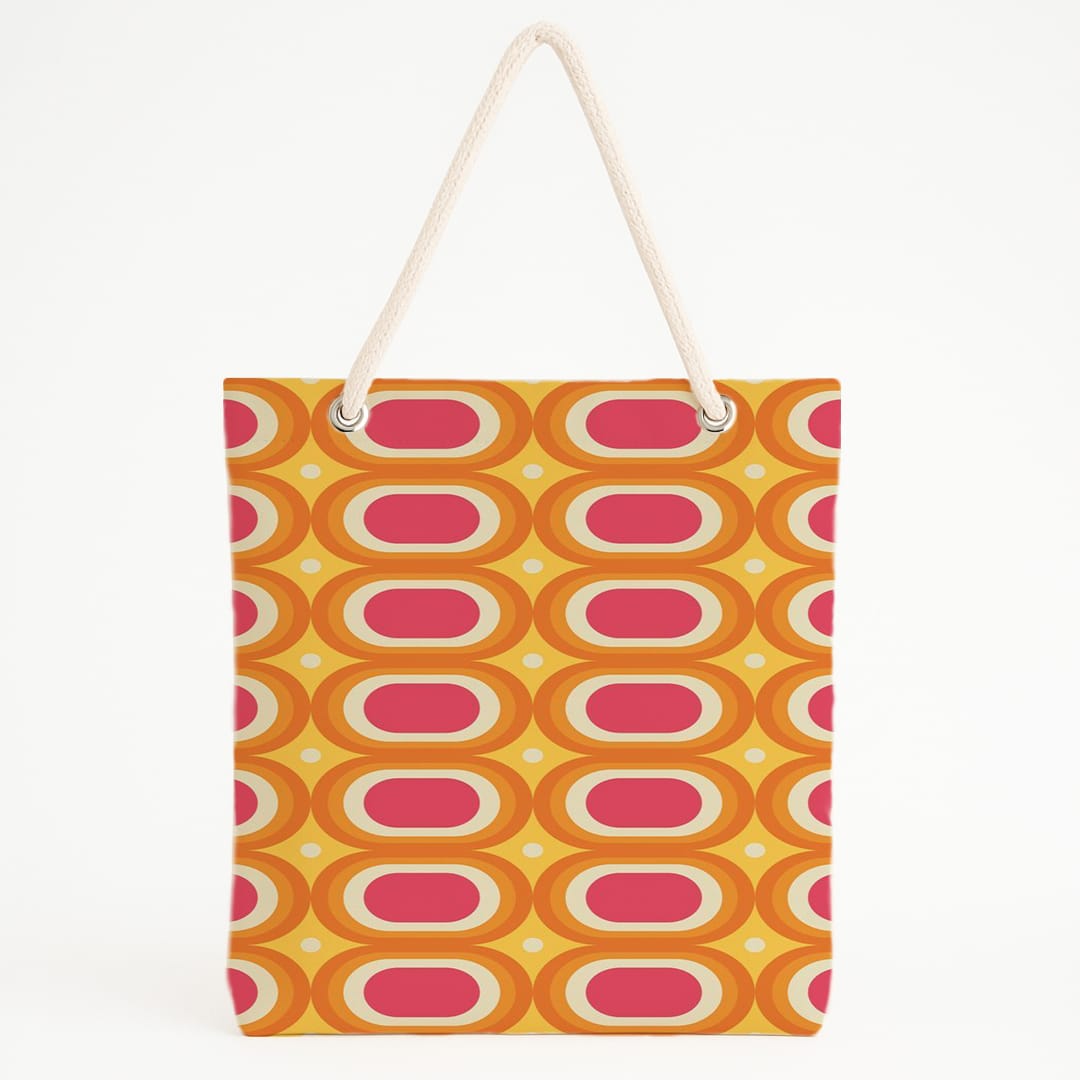 oval desenli turuncu plaj çantası, 70’ler tavrıyla yazın enerjisini taşır. Günlük kullanım için özgün ve dikkat çekici bir tasarım sunar.