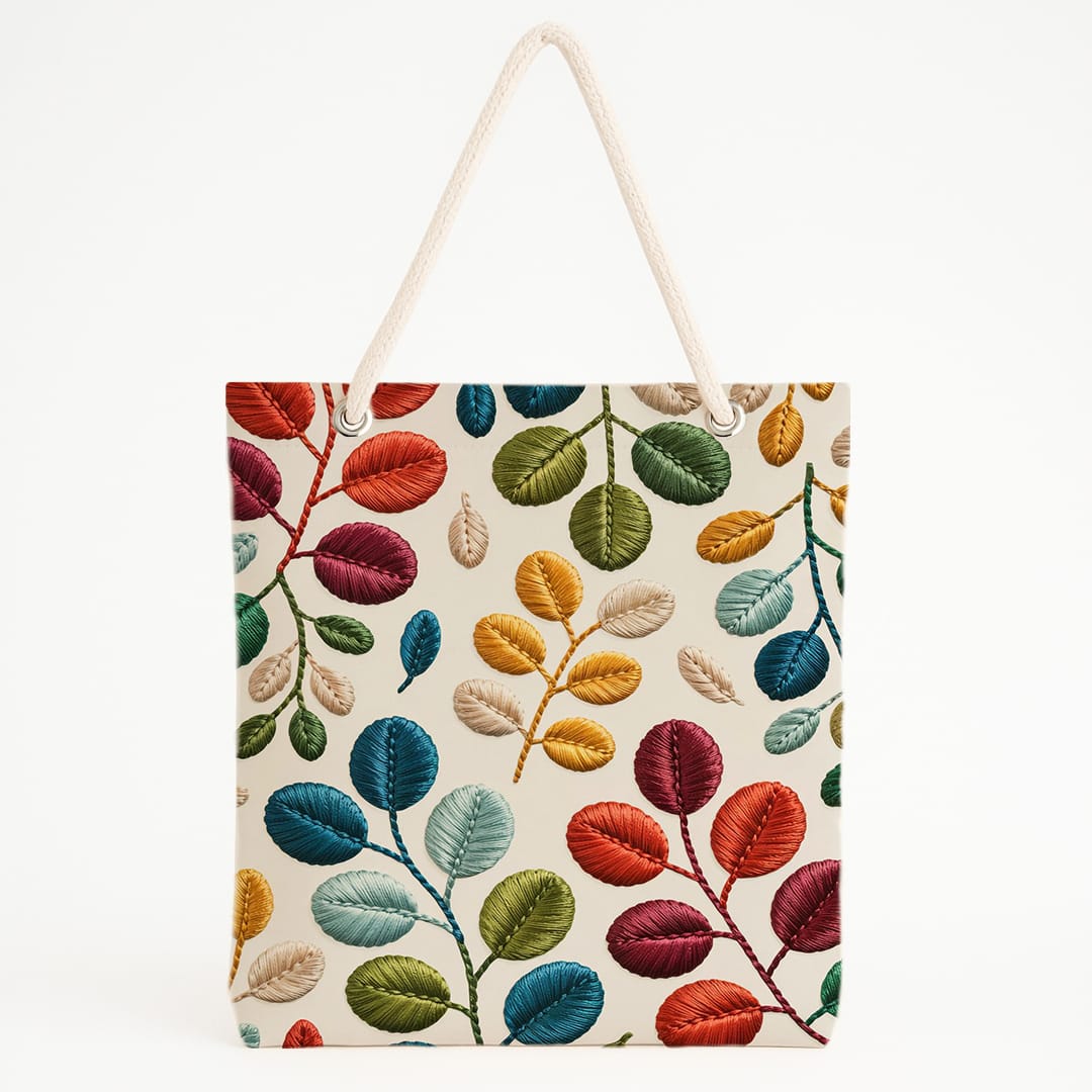 Renkli Yaprak Desenli Krem Zeminli Nakışlı Plaj Çantası