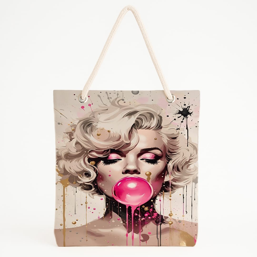 Sakız şişiren kadın temalı sanatsal plaj çantası, sokak stilini ve yazın enerjisini taşır. Günlük kullanım için özgün ve dikkat çekici tasarım sunar.